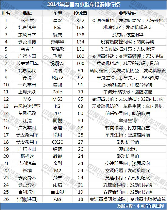 2014年度國內(nèi)小型車投訴排行榜