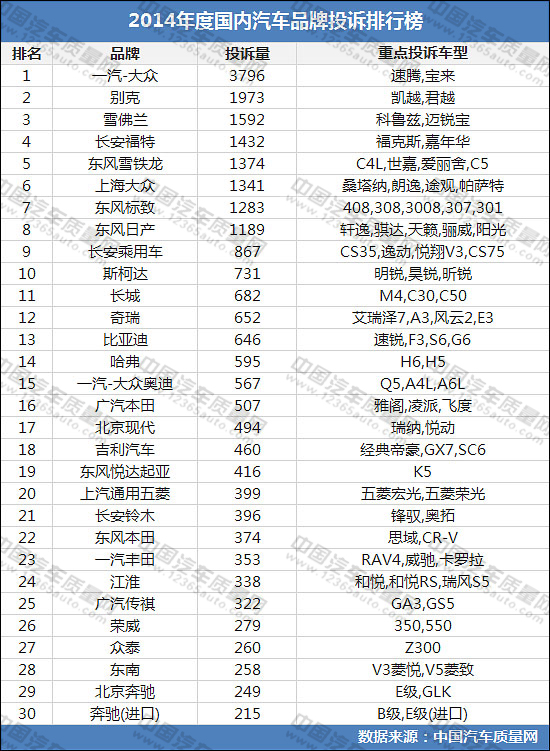 2014年度國內(nèi)汽車品牌投訴排行榜