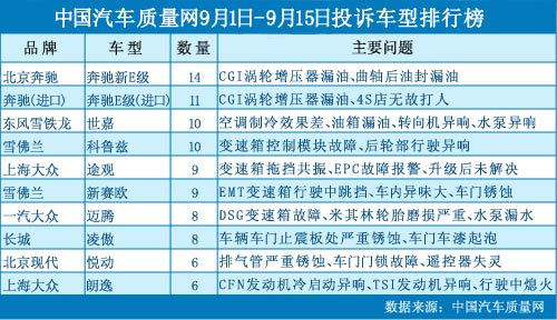 在本時(shí)間段內(nèi)(2012年9月1日~15日),中國汽車質(zhì)量網(wǎng)(www.oa021.com.cn)接到消費(fèi)者針對汽車產(chǎn)品的投訴總計(jì)365宗,共涉及140款車型,兩項(xiàng)數(shù)據(jù)相比8月下半月有所下降。 奔馳E級渦輪增壓器普遍漏油 車主不滿解決方案 9月3日,中國汽車質(zhì)量網(wǎng)發(fā)表E級車...
