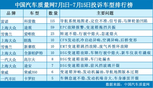 在本時間段內(nèi)(2012年7月1日~15日),中國汽車質(zhì)量網(wǎng)(www.oa021.com.cn)接到消費者針對汽車產(chǎn)品的投訴總計621宗,共涉及140款車型,相比6月下半月均有所上升。 雷諾科雷傲因?qū)Ш絾栴}二度榜首 在2012年6月下半月投訴排行榜中,雷諾科雷傲因原廠所配...