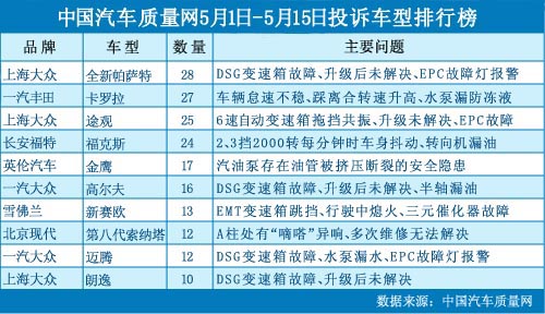 中國(guó)汽車(chē)質(zhì)量網(wǎng)2012年5月上半月投訴排行