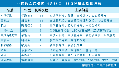 中國(guó)汽車質(zhì)量網(wǎng)10月下半月投訴車型排行榜