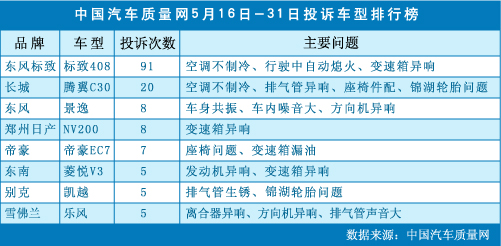 中國汽車質量網5月下半月投訴車型排行榜