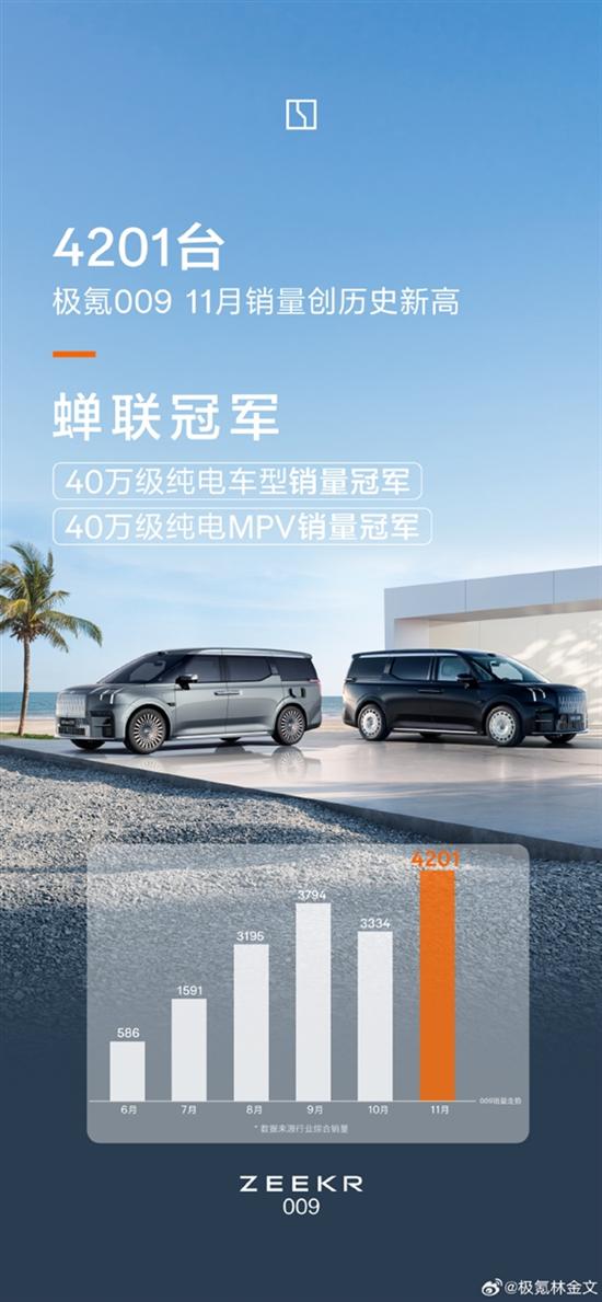 快科技12月11日消息,極氪智能科技副總裁林金文今日宣布,旗下MPV車(chē)型極氪009在十一月銷(xiāo)量達(dá)到4201臺(tái),再創(chuàng)歷史新高,蟬聯(lián)40萬(wàn)級(jí)純電車(chē)型與40萬(wàn)級(jí)純電MPV車(chē)型銷(xiāo)量冠軍。