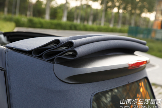 車頂為黑色帆布設(shè)計,通過車鑰匙上的按鈕或者車內(nèi)的按鈕,車頂就會向后逐漸收起,想開多大就可以開多大。你還可以將車頂完全收縮于車后側(cè),并將車門上方的橫梁摘下,讓敞篷來的更徹底些。