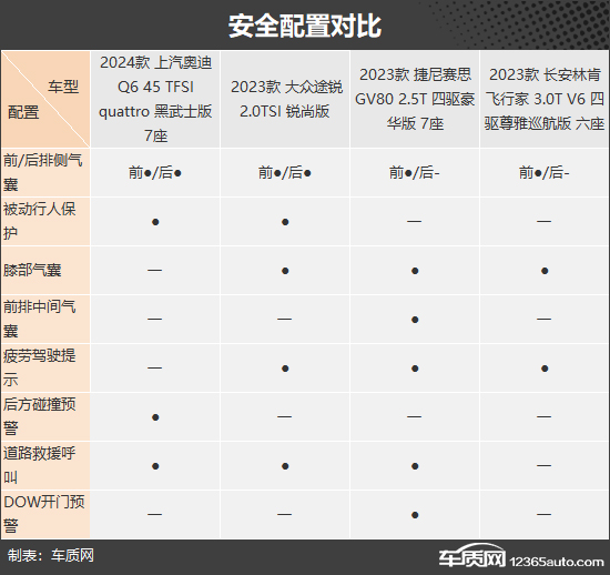 在主/被動安全配置方面,四款車型除配備了豐富的基礎配置外,還配備了部分高階配置。其中,上汽奧迪Q6配備了獨有的后方碰撞預警;捷尼賽思GV80則配備了獨有的前排中間氣囊和DOW開門預警;相較之下,大眾途銳和長安林肯飛行家沒有太多亮點配置,但整體表現(xiàn)也符合同級別主流水平。