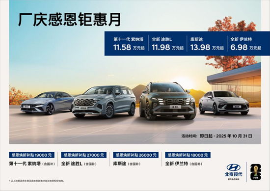 適逢國慶黃金周和金九銀十購車旺季,北京現(xiàn)代推出“廠慶感恩鉅惠月”活動(dòng),即日起至10月31日,購買全新途勝L、全新伊蘭特、庫斯途、第十一代索納塔等車型可享受“優(yōu)惠+補(bǔ)貼”雙重驚喜。